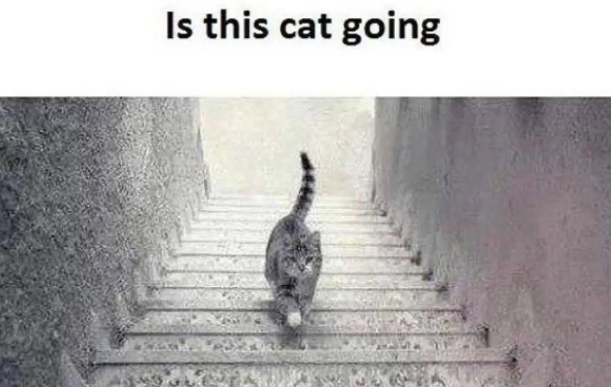 Repéré sur The Daily Mail , le message 9Gag demande aux lecteurs si le chat monte ou descend les escaliers.
